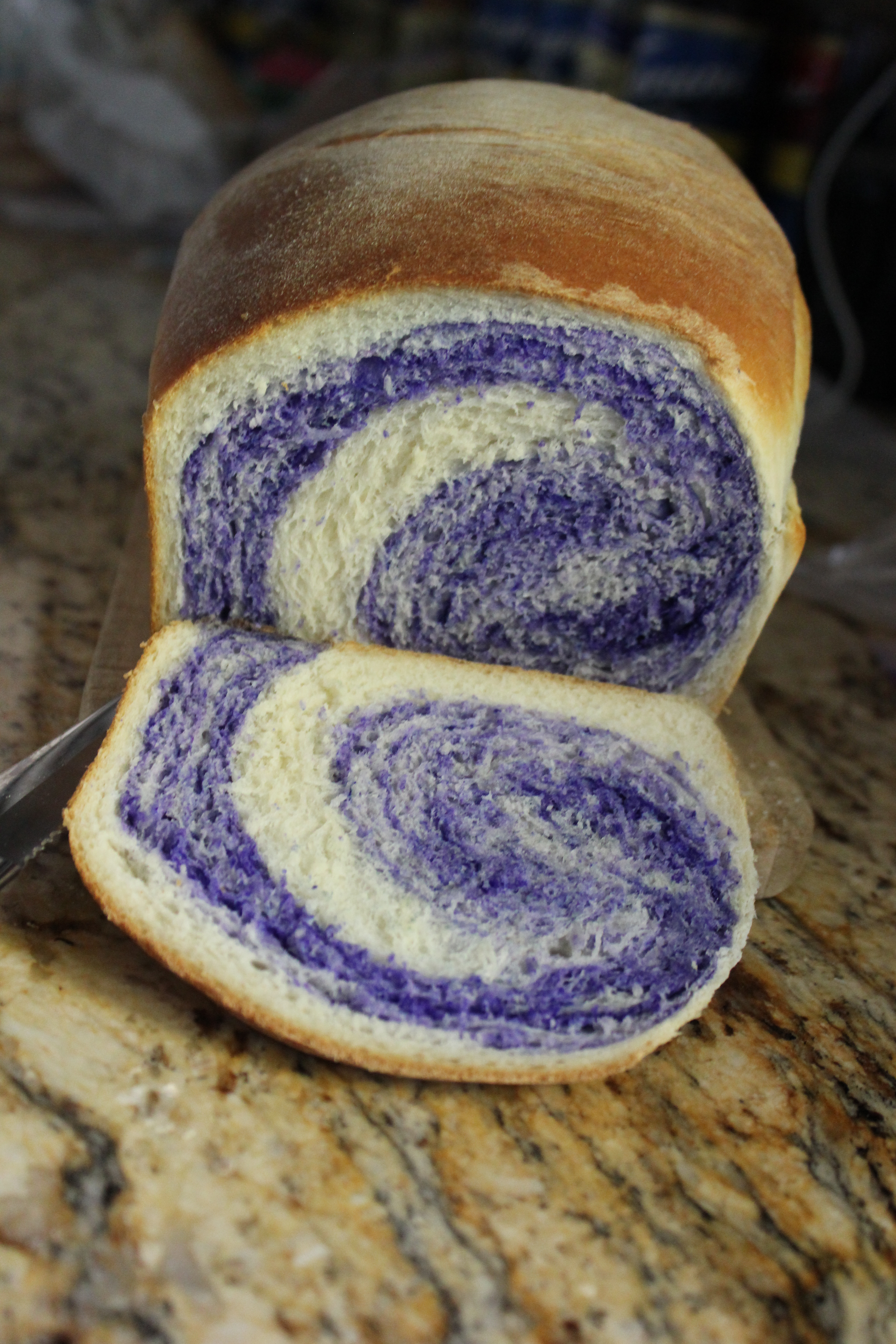 Sometimes my bread has a theme. One loaf I named “Four Shades of Red.” (Had a hard time visualizing gray bread!) Then there are breads that are themed based on the week. There was a loaf in honor of the beginning of fall. Then there was the purple and white loaf in recognition of the high school‘s homecoming. My last loaf was orange, white and black in anticipation of Halloween. I did make a completely orange loaf of bread. The family was not very fond of that. They definitely prefer multi-colored bread.